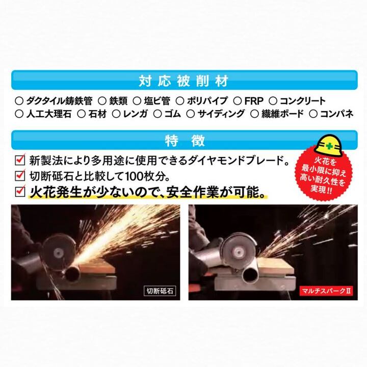 鋳鉄管や銅板の切断等はレジノイド砥石と比較して、火花の発生を最小限に抑え、ダイヤ砥粉の目こぼれが少なく、高い耐久性を実現。