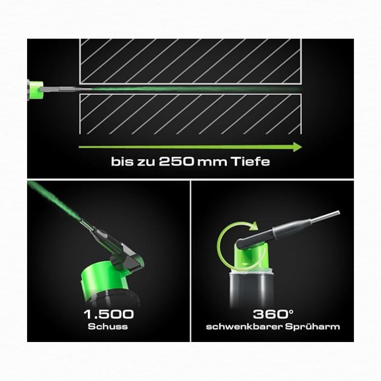 最大25cmのドリル穴に正確なマーキング。 グリーン蛍光チョークパウダー。 ドリルホールを正確に全面的に表現。 最大1,500ショット寿命。 詰め替え可能で長期間使用できます。 直径3mmからのすべてのドリル穴のサイズに対応。 手の届きにくい箇所に360°スプレーノズルアーム。 ほこりや湿気を効果的に防ぎます。 木材、電気、配管、建設作業に最適です。 ドライ、ウェット、ラフ、スムーズなど、すべての表面に貼り付けられます。 滑らかな表面から簡単に取り外せます。
